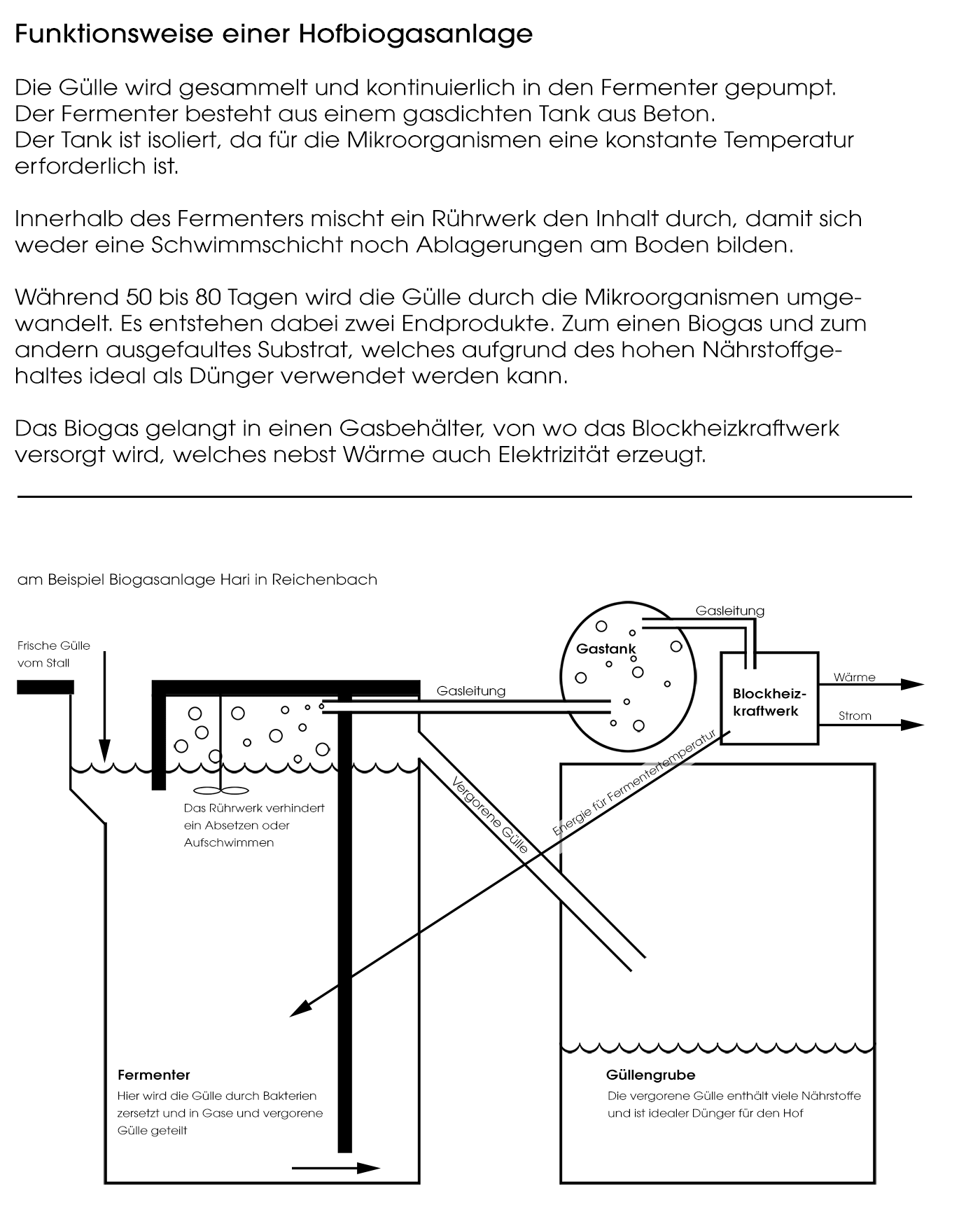 Ohne fremdes organisches Material produziert man seinen Strom mit erneuerbarer Energie selbst und trägt auch zu einer geringeren Methangasbelastung der Atmosphäre bei. Das in jedem Bauernhof anfallende Methangas wird gezielt gefördert und im Motor zu Wärme und Strom verwandelt.